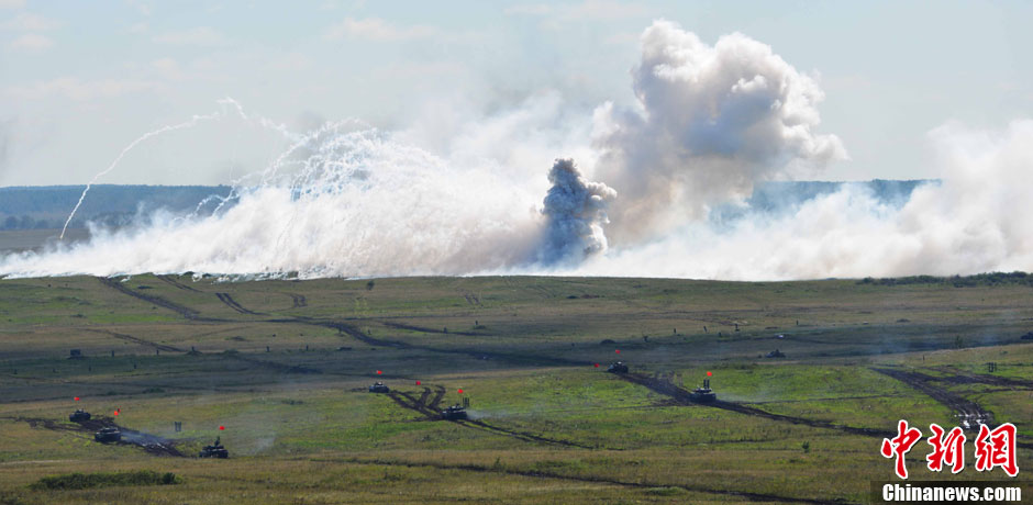 8月12日12時(shí)(北京時(shí)間下午2時(shí)),“和平使命-2013”中俄聯(lián)合反恐軍事演習(xí),在俄羅斯切巴爾庫爾合同訓(xùn)練場進(jìn)行了實(shí)兵實(shí)彈協(xié)同訓(xùn)練。圖為中方裝甲車成攻擊隊(duì)形向敵縱深發(fā)展攻擊。中新社發(fā) 譚長俊 攝