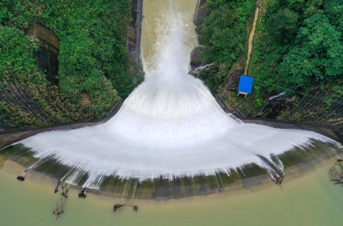 近日連降大雨,廣西桂林市全州縣源口水庫溢洪瀑布迎來最佳觀賞期。無人機俯瞰水庫溢洪口,一泓碧水從50余米壩面流落,宛如一把柔美的白色蒲扇輕柔落下,美輪美奐。源口水庫雨季溢洪場景已成為當?shù)厥忻翊蚩ǖ亍?圖片來源:ICphoto