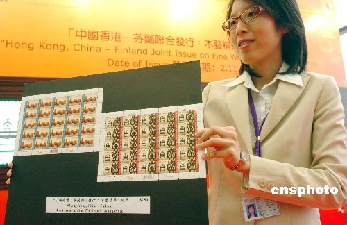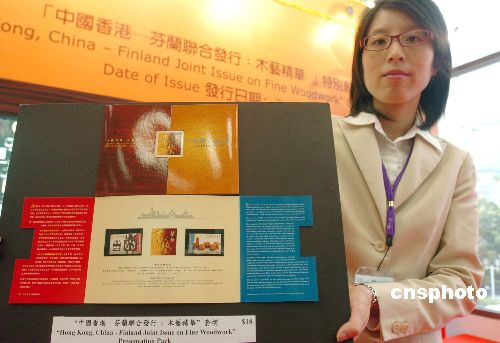 11月2日,香港郵政署與芬蘭聯(lián)合發(fā)行“木藝精華”特別郵票舉行發(fā)行儀式,該套兩枚面值港幣五元的郵票,分別展示中國香港的清代夔龍紋紫檀太師椅,以及芬蘭的千禧年代橢圓皺紋樺木盛器。圖為香港郵政署職員展示“木藝精華”特別郵票的套折。中新社發(fā) 鄧慶樂 攝