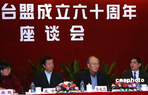十一月十日,近百位上海老中青三代臺(tái)胞、臺(tái)盟盟員聚會(huì)座談,紀(jì)念臺(tái)灣民主自治同盟成立六十周年。當(dāng)日,臺(tái)盟上海市委還舉行了“電影劇本《啊,謝雪紅》讀書演講會(huì)”,緬懷臺(tái)盟首任主席、臺(tái)灣知名人士謝雪紅女士。一九四七年十一月十二日,臺(tái)盟在香港成立,是當(dāng)代中國(guó)八個(gè)民主黨派之一。圖為臺(tái)盟中央副主席李敏寬(右二)在座談時(shí)表示,臺(tái)盟走過了六十年愛國(guó)的革命的光榮道路,始終與中國(guó)共產(chǎn)黨風(fēng)雨同舟、長(zhǎng)期合作。中新社發(fā) 許曉青 攝