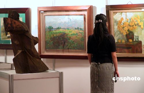 十一月十二日,現(xiàn)代中國藝術(shù)家張大千、吳冠中、范曾以及臺灣雕塑大師朱銘等人作品在臺北展出,這些作品將出現(xiàn)在本月下旬香港一家藝術(shù)品拍賣公司邦瀚斯舉辦的秋季拍賣會上。圖為臺北市民觀摩藝術(shù)品。中新社發(fā) 劉舒凌 攝