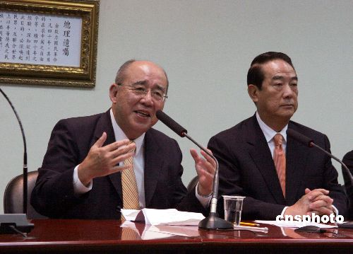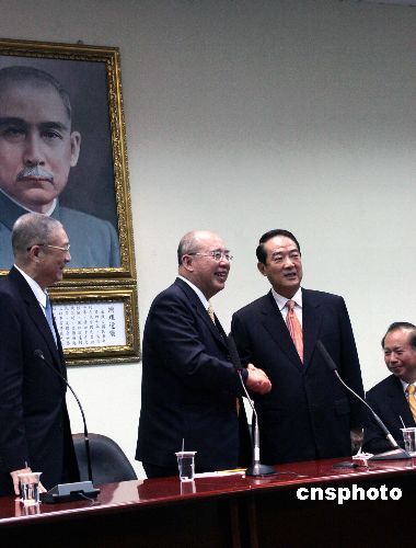 11月14日,中國國民黨主席吳伯雄和親民黨主席宋楚瑜在臺北一起舉行記者會,公布列國民黨34席不分區(qū)“立委”提名名單的4名親民黨成員。親民黨另有6位成員獲國親推薦,以國民黨名義參選區(qū)域“立委”選舉。中新社發(fā) 黃少華 攝