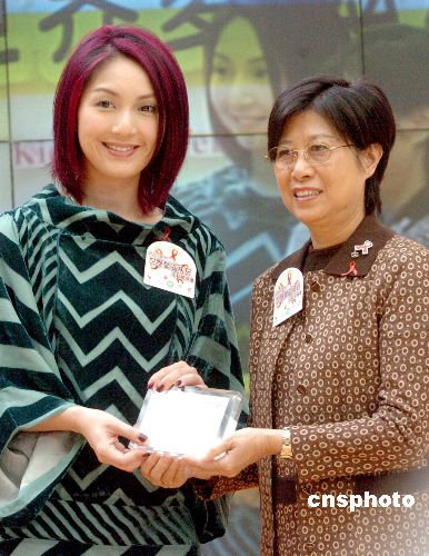 11月30日,“世界愛滋病日2007活動開展禮”在香港舉行開啟儀式,行政長官夫人曾鮑笑薇代表大會向藝人楊千嬅致送紀念品,以感謝她為活動拍攝宣傳短片,推廣正視對抗愛滋病的訊息。中新社發(fā) 鄧慶樂 攝