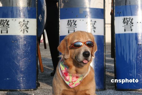 十二月六日,臺(tái)北“中正紀(jì)念館”在爭議聲中開始封館,“大中至正”牌樓將要拆除。圖為一只被主人戴上墨鏡的狗站在警察人墻前,成為媒體拍照“明星”。中新社發(fā) 董會(huì)峰 攝