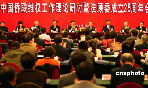 12月8日至9日,中國(guó)僑聯(lián)維權(quán)工作理論研討暨紀(jì)念法顧委成立25周年會(huì)議在北京召開,會(huì)議表彰了近五年來(lái)各地僑聯(lián)維權(quán)工作先進(jìn)單位和個(gè)人。會(huì)議就建立維權(quán)長(zhǎng)效機(jī)制,切實(shí)維護(hù)歸僑僑眷和海外僑胞在國(guó)內(nèi)的合法權(quán)利和利益進(jìn)行理論研討。中國(guó)僑聯(lián)法顧委是1982年5月6日成立的中國(guó)僑聯(lián)高層法律服務(wù)顧問(wèn)機(jī)構(gòu)。中新社發(fā) 張勤 攝