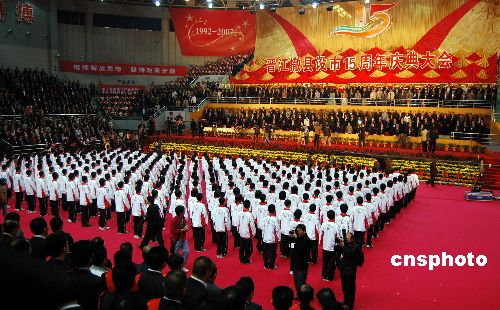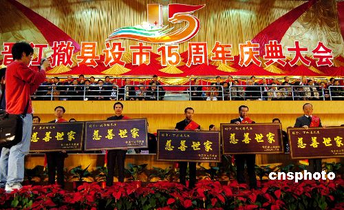 十二月八日, 福建晉江撤縣設(shè)市十五周年慶典大會(huì)在晉江市祖昌體育館隆重舉行。中央、福建省、泉州市領(lǐng)導(dǎo),香港、澳門、臺(tái)灣地區(qū)晉江鄉(xiāng)親社團(tuán)代表,菲律賓、新加坡、馬來西來、印尼、緬甸等國家的晉江鄉(xiāng)親慶賀團(tuán)及晉江各界人士共三千八百多人參加了慶典大會(huì)。中華海外聯(lián)誼會(huì)等五十多個(gè)單位發(fā)來賀電賀信。在慶典大會(huì)上,晉江市政府表彰了捐資晉江慈善事業(yè)實(shí)際到款千萬元人民幣以上的慈善世家、五百萬元人民幣以上的慈善家和三百萬元人民幣以上的慈善大使。中新社發(fā) 傅丹丹 攝