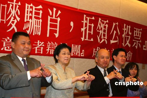十二月十日,臺灣民間團(tuán)體“民主行動聯(lián)盟”在臺北舉行記者會,宣布由十多位學(xué)者、名嘴組成“入、返聯(lián)公投”反方意見辯論團(tuán)!懊裰餍袆勇(lián)盟”總召集人黃光國教授(左三)并呼吁民眾,為了擺脫民粹政治、不激化兩岸關(guān)系,拒領(lǐng)“入、返聯(lián)公投”票。中新社發(fā) 董會峰 攝