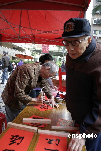 十二月十四日,二00七臺北眷村文化節(jié)開幕,老人們在活動現(xiàn)場書寫對聯(lián)。中新社發(fā) 陳國華 攝
