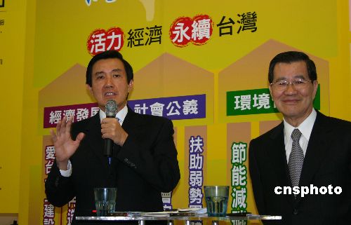 十二月十九日,國民黨二00八參選人馬英九及其搭檔蕭萬長聯(lián)合發(fā)布了《臺灣經(jīng)濟新藍圖之二·產(chǎn)業(yè)再造及全球連結報告》。中新社發(fā) 陳國華 攝