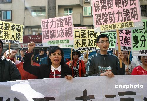 2007年是兩岸通婚二十周年,目前有超過二十五萬(wàn)名大陸配偶在臺(tái)灣生活。但由于當(dāng)局的限制性政策,大陸配偶在島內(nèi)的權(quán)利難以得到保障。十二月二十一日,“中華兩岸婚姻協(xié)調(diào)促進(jìn)會(huì)”在“移民署”門前集會(huì),申要人權(quán)與平等待遇。中新社發(fā) 陳國(guó)華 攝