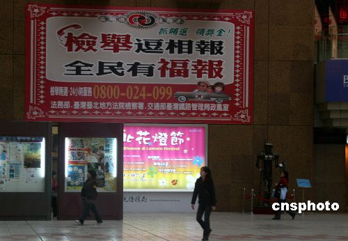 一月七日,距臺灣第七屆“立委”選舉投票日只有五天,選戰(zhàn)日趨激烈。臺灣檢方也加強(qiáng)抓賄選的街頭宣傳,圖為臺北火車站售票大廳內(nèi)懸掛的檢舉抓到賄選可領(lǐng)獎金的巨幅廣告。中新社發(fā) 陳立宇 攝