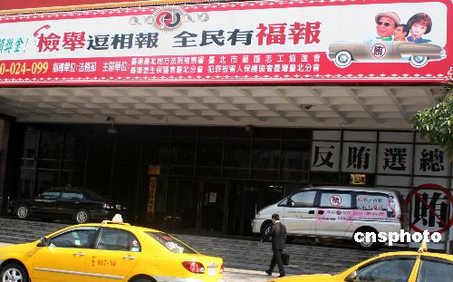 一月十一日,距臺灣第七屆“立委”選舉僅剩一天,選戰(zhàn)進入最后倒計時。圖為臺灣臺北市地方法院、地方檢察署上懸掛的鼓勵民眾檢舉賄選的條幅。中新社發(fā) 陳立宇 攝