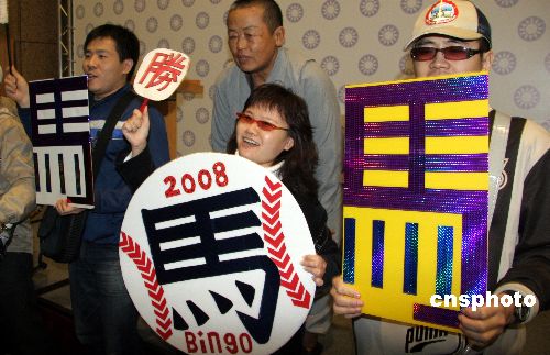 一月十二日晚,支持國民黨的民眾在臺北中國國民黨中央黨部大樓里歡慶“立委”選舉大勝,并打出期盼馬英九參加二○○八年“大選”馬上成功的標(biāo)語。臺灣第七屆“立委”選舉當(dāng)晚揭曉,國民黨以八十一席獲勝。中新社發(fā) 孫自法 攝