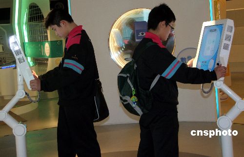 圖為兩位中學生在展區(qū)饒有興致地感受IPv6在未來生活中的應用。