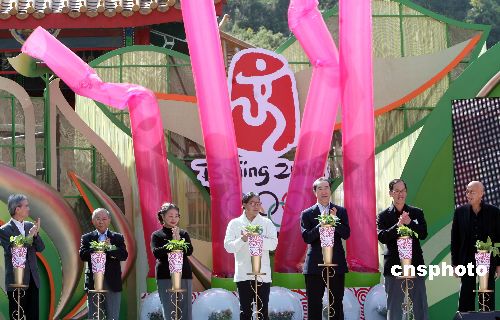 香港特別行政區(qū)政務司司長唐英年(右三)、香港奧委會會長霍震霆(右四)等在香港海洋公園出席“齊保育·愛環(huán)保”二零零八北京奧運會二百天倒數(shù)活動。