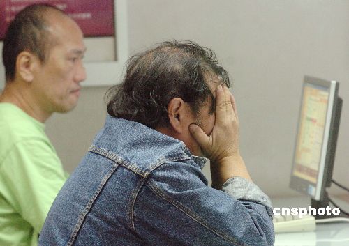 一月二十二日,受環(huán)球股市下挫影響,港股急挫二千零六十一點二三(2061.23)收市,創(chuàng)歷來最大點數(shù)跌幅。圖為當日股民在銀行關(guān)注行情,對股市表現(xiàn)極度無奈。中新社發(fā) 鄧慶樂 攝