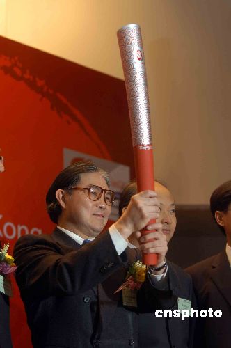 一月三十日,中國(guó)香港體育協(xié)會(huì)暨香港奧林匹克委員會(huì)會(huì)長(zhǎng)霍震霆在新聞發(fā)布會(huì)上,展示北京奧運(yùn)會(huì)火炬。港協(xié)暨奧林匹克委員會(huì)當(dāng)天宣布,北京奧運(yùn)火炬?zhèn)魉蛯⒂诮衲晡逶露盏竭_(dá)香港,一百二十名火炬手,會(huì)在港九、新界等六個(gè)路段傳送火炬。中新社發(fā) 譚達(dá)明 攝