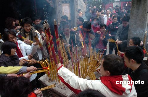 二月九日(農(nóng)歷大年初三),澳門媽閣廟內(nèi)外人流不斷,市民上香拜神,祈求新一年平安、幸福。中新社發(fā) 史利 攝