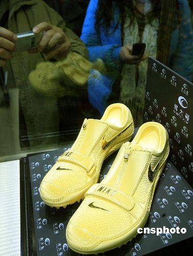 農(nóng)歷新年喜慶時節(jié),香港沙田馬場舉辦黃金藝術珍品展覽,展出二十多件設計獨特、手工精致的黃金藝術珍品。圖中以有世界飛人之稱劉翔破世界記錄時,以其所穿跑鞋實物原大打造的黃金跑鞋,引來眾多觀眾興趣。這雙黃金跑鞋長二十六厘米,黃金重約十六兩,價值超過二十三萬多港元。中新社發(fā) 王麗南 攝