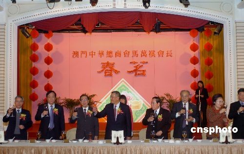 二月十六日晚,澳門中華總商會在萬豪軒酒店舉行春茗晚宴,澳門特首何厚鏵發(fā)布演辭并與佳賓舉杯共迎鼠年新春。中新社發(fā) 史利 攝