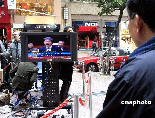 二月二十七日,香港財(cái)政司司長(zhǎng)曾俊華向立法會(huì)提交二零零八至零九年度財(cái)政預(yù)算案,公布政府綜合盈余達(dá)一千一百五十六億元,創(chuàng)歷來(lái)新高,并推出多項(xiàng)減稅和惠及社會(huì)的措施。當(dāng)?shù)仉娨暸_(tái)街頭直播曾俊華作報(bào)告,并收集市民意見(jiàn)。中新社發(fā) 王麗南 攝