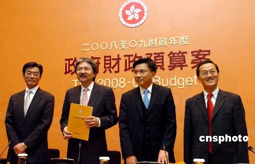 二月二十七日,香港財(cái)政司司長(zhǎng)曾俊華(左二)、財(cái)經(jīng)事務(wù)及庫務(wù)局局長(zhǎng)陳家強(qiáng)(左三)、政府經(jīng)濟(jì)顧問郭國全(右一)等出席二零零八至零九年度財(cái)政預(yù)算案記者會(huì),回答記者有關(guān)提問。中新社發(fā) 鄧慶樂 攝