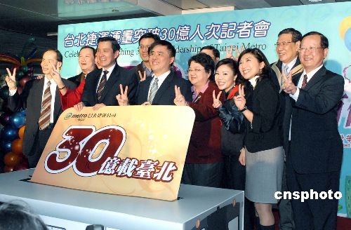 臺(tái)北市捷運(yùn)運(yùn)量累計(jì)突破三十億人次。圖為三日下午臺(tái)北捷運(yùn)臺(tái)北車站內(nèi),臺(tái)北市前任市長(zhǎng)馬英九、現(xiàn)任市長(zhǎng)郝龍斌等參加慶祝記者會(huì)。中新社發(fā) 曾嘉 攝