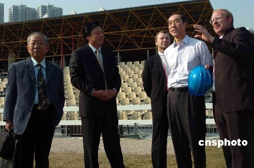 三月四日下午,香港署理行政長官唐英年(右二)與多名局長、警務(wù)處長,連同北京奧組委官員參觀由沙田香港體育學(xué)院改建而成的奧運(yùn)及殘奧馬術(shù)主要比賽場(chǎng)地和相關(guān)配套工程。中新社發(fā) 譚達(dá)明 攝