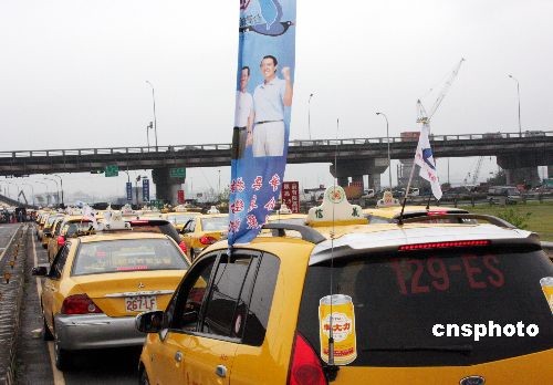 3月10日,一向給外界挺綠印象的臺(tái)北全民計(jì)程車(chē)聯(lián)誼會(huì)決定在此次臺(tái)灣大選中棄綠轉(zhuǎn)藍(lán),在總會(huì)長(zhǎng)邱奕枝號(hào)召下,陸續(xù)聚集2500輛計(jì)程車(chē)并成立馬蕭后援會(huì),場(chǎng)面壯觀。圖為在集會(huì)現(xiàn)場(chǎng),許多計(jì)程車(chē)插上馬蕭競(jìng)選旗幟,司機(jī)戴上有關(guān)標(biāo)識(shí)帽子。中新社發(fā) 黃少華 攝