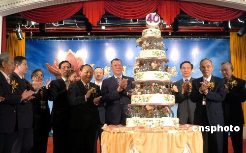 三月二十六日,澳門(mén)特首何厚鏵、澳門(mén)中聯(lián)辦主任白志健、中國(guó)僑聯(lián)主席林軍等嘉賓在萬(wàn)豪軒酒家切開(kāi)生日蛋糕,祝賀澳門(mén)歸僑總會(huì)成立四十周年。中新社發(fā) 史利 攝