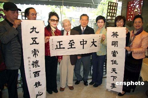 四月一日,臺灣知名書法家楊家麟(左四)在其八十八歲“生日文化小聚”上,現(xiàn)場書寫自己創(chuàng)作的對聯(lián)贈送馬英九,希望他常懷百姓之心,把臺灣經(jīng)濟搞好。左五為馬英九、蕭萬長派來的代表林先生。中新社發(fā) 董會峰 攝