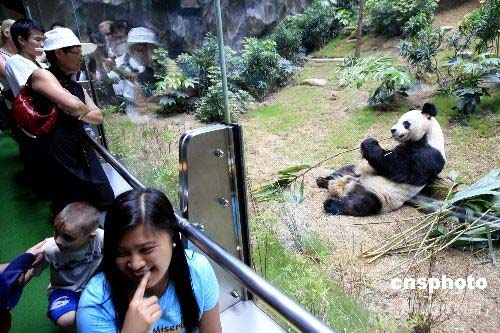 四月二十六日是大熊貓盈盈及樂(lè)樂(lè)到港一周年紀(jì)念日,香港海洋公園將于四月二十六日至五月三十一日推出“尋找熊盈樂(lè)”香港身份證推廣優(yōu)惠活動(dòng)。凡身份證或出生證明書上的名字印有“熊”、“盈”、“樂(lè)”或“P 、A 、N 、D、 A”的其中一個(gè)字母,即可享有購(gòu)海洋公園日間入場(chǎng)門券八折優(yōu)惠,并有十人獲得雙人探訪“四川大熊貓基地”之旅。圖為二十二日游人在海洋公園觀賞大熊貓憨態(tài)可掬的吃竹子。中新社發(fā) 王麗南 攝