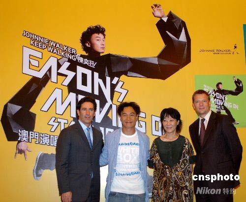五月八日,香港歌星陳奕迅(左二)在澳門威尼斯人酒店出席個人世界巡回演唱會記者招待會,介紹其個人世界巡回演唱會最后一站的澳門演唱會將于七月十九日在澳門威尼斯酒店舉行。中新社發(fā) 史利 攝
