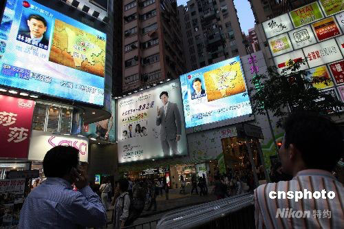 五月十二日晚,香港市民在街頭觀看新聞,關(guān)注四川等地發(fā)生的地震消息。當(dāng)天下午,香港天文臺(tái)也接獲市民報(bào)告,多名市民表示感覺到一次震動(dòng)。中新社發(fā) 洪少葵 攝