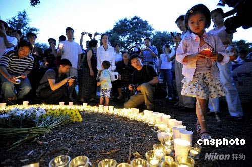 當?shù)貢r間五月十七日晚,美國加州硅谷華人在山景城街心公園舉行燭光祈禱儀式,悼念汶川大地震的死難同胞,祝愿仍處困境的災(zāi)民平安,并向奮戰(zhàn)在抗震救災(zāi)第一線的軍人和醫(yī)護人員致敬。中新社發(fā) 陳鋼 攝