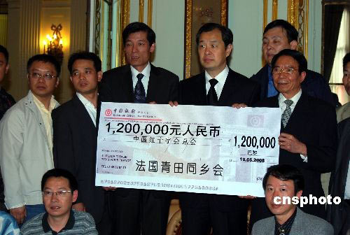 法國青田同鄉(xiāng)會(huì)十九日通過中國駐法大使館,向四川地震災(zāi)區(qū)捐款,支持抗震救災(zāi)。至今,旅法僑胞向四川地震災(zāi)區(qū)捐款已超過一千萬元人民幣。中新社發(fā) 吳衛(wèi)中 攝