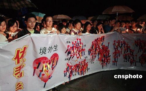 5月19日中國全國哀悼日,福建華僑大學學子點起蠟燭,齊唱《讓世界充滿愛》為四川地震受難者祈禱。圖為在校境外學生手拉條幅,為逝者哀悼、為生者加油。中新社發(fā) 傅丹丹 攝