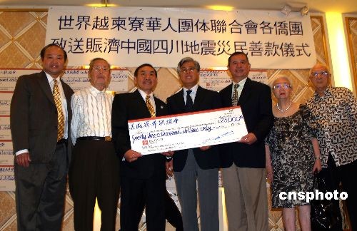 5月19日,世界越柬寮團(tuán)體聯(lián)合會600多位華人華僑在洛杉磯舉辦向汶川地震災(zāi)區(qū)募款活動,他們集體起立默哀3分鐘,現(xiàn)場募款50萬美金,當(dāng)即交由中國駐洛杉磯總領(lǐng)事館總領(lǐng)事張云(中)送汶川災(zāi)區(qū)。