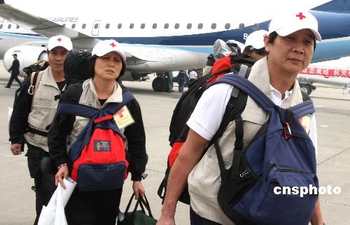 5月20日下午,以陳文長(zhǎng)為領(lǐng)隊(duì)的臺(tái)灣紅十字醫(yī)療隊(duì)一行37人以“兩岸直航”的形式乘坐臺(tái)灣華信航空的專(zhuān)機(jī)抵達(dá)成都機(jī)場(chǎng),之后即刻前往汶川大地震的重災(zāi)區(qū)德陽(yáng)市開(kāi)展醫(yī)療救治。中新社發(fā) 任晨鳴 攝
