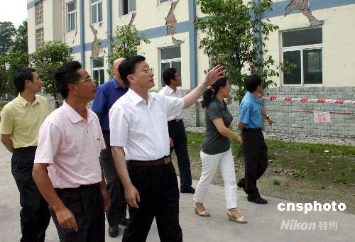 5月31日,國務(wù)院僑辦副主任馬儒沛一行來到四川省彭州市察看該市通濟(jì)中學(xué)在地震中受損情況。圖為馬儒沛在聽取通濟(jì)中學(xué)校長唐保良的介紹。中新社發(fā) 伊西科 攝