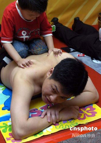 六月五日,香港一商場舉行“感恩父親節(jié)”活動,邀請幾名小朋友為父親擦背按摩,預祝甜蜜父親節(jié)的來臨。中新社發(fā) 譚達明 攝