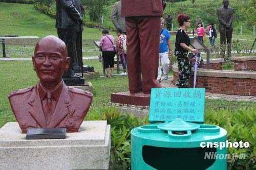 去年12月23日被臺灣民進黨執(zhí)政當(dāng)局關(guān)閉的兩蔣陵寢,今年5月31日再度開放。作為兩蔣文化園區(qū)組成部分的慈湖雕塑公園內(nèi),目前陳列有臺灣各地機關(guān)學(xué)校送來的不同型式、不同材質(zhì)的蔣介石塑像一百四十一尊。圖為慈湖雕塑公園內(nèi)一尊蔣介石先生銅像與垃圾桶并列陳放,前來參觀的游客認為此舉不嚴肅也不妥,他們希望管理部門應(yīng)該糾正。中新社發(fā) 耿軍 攝