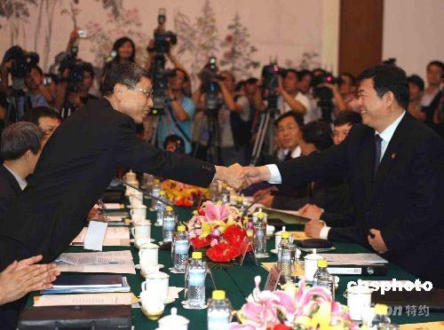 6月12日上午,海峽兩岸關(guān)系協(xié)會副會長孫亞夫(右)與臺灣海峽交流基金會副董事長高孔廉在北京釣魚臺5號樓協(xié)商兩岸周末包機(jī)。中新社發(fā) 任晨鳴 攝