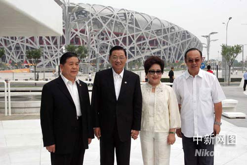 6月12日下午,海峽交流基金會董事長江丙坤參觀了北京奧運(yùn)會場館,圖為江丙坤等人在“鳥巢”前留影。中新社記者 張宇 攝