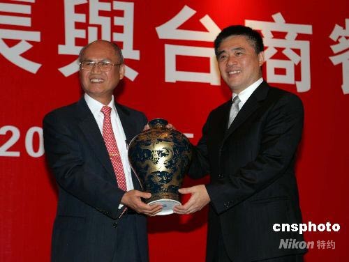 6月25日晚,臺(tái)北市長(zhǎng)郝龍斌在上海與臺(tái)商餐敘時(shí),贊賞臺(tái)商不僅在家鄉(xiāng)有愛心,在大陸也一樣有愛心,特別是此次四川地震發(fā)生后,臺(tái)商踴躍賑災(zāi)精神可嘉。圖為郝龍斌與上海臺(tái)商協(xié)會(huì)會(huì)長(zhǎng)李茂盛互贈(zèng)禮品。