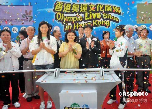 為營造熱烈的奧運(yùn)氣氛,讓香港市民積極投入北京二零零八年奧運(yùn)會(huì),香港康樂及文化事務(wù)署七月八日宣布,將于八月奧運(yùn)會(huì)舉行期間在維多利亞公園及沙田公園設(shè)立奧運(yùn)文化廣場(chǎng)。圖為香港民政事務(wù)局常任秘書長尤曾家麗及康文署署長周達(dá)明與香港精英運(yùn)動(dòng)員、十八區(qū)區(qū)議會(huì)和體育總會(huì)的代表出席當(dāng)日舉行的開展儀式。 中新社發(fā) 鄧慶樂 攝