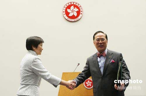 七月十二日,國(guó)務(wù)院決定,任命劉吳惠蘭為香港特別行政區(qū)商務(wù)及經(jīng)濟(jì)發(fā)展局局長(zhǎng),免去馬時(shí)亨的商務(wù)及經(jīng)濟(jì)發(fā)展局局長(zhǎng)職務(wù)。圖為當(dāng)日香港特別行政區(qū)行政長(zhǎng)官曾蔭權(quán)與劉吳惠蘭在政府總部出席記者會(huì)。中新社發(fā) 武仲林 攝