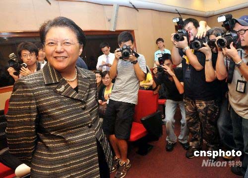 七月十四日,即將卸任的香港立法會主席范徐麗泰,在立法會大樓舉行新聞簡報會,她希望行政立法關系日后可以做到“互相尊重、以誠待人、一視同仁、合作有望”。并總結過去十一年出任立法會主席,是她從政生涯中最高峰的時刻,認為自己已盡力工作,現(xiàn)時是時候功成身退。中新社發(fā) 鄧慶樂 攝