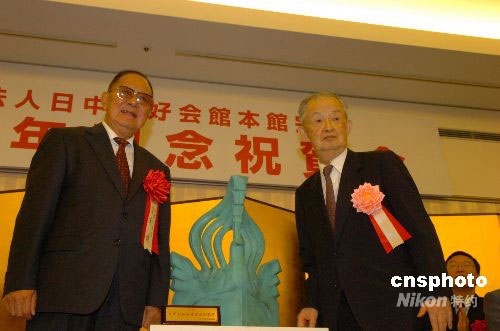9月5日,日本財(cái)團(tuán)法人日中友好會(huì)館舉行大型酒會(huì)慶祝該會(huì)本館建館20周年,中國(guó)日本友好協(xié)會(huì)會(huì)長(zhǎng)宋健、中國(guó)駐日大使崔天凱、日本眾院議長(zhǎng)河野洋平等數(shù)百名中日友好人士出席。圖為宋健會(huì)長(zhǎng)(左)代表中方向日中友好會(huì)館會(huì)長(zhǎng)林義郎先生贈(zèng)送賀禮——雕塑作品《鳳凰》。中新社發(fā) 朱沿華 攝