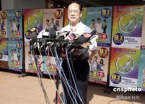 九月七日,香港舉行2008年立法會選舉,香港特區(qū)行政長官曾蔭權和夫人曾鮑笑薇在高主教書院投票。圖為曾陰權在投票后接受媒體訪問。中新社發(fā) 張勤 攝